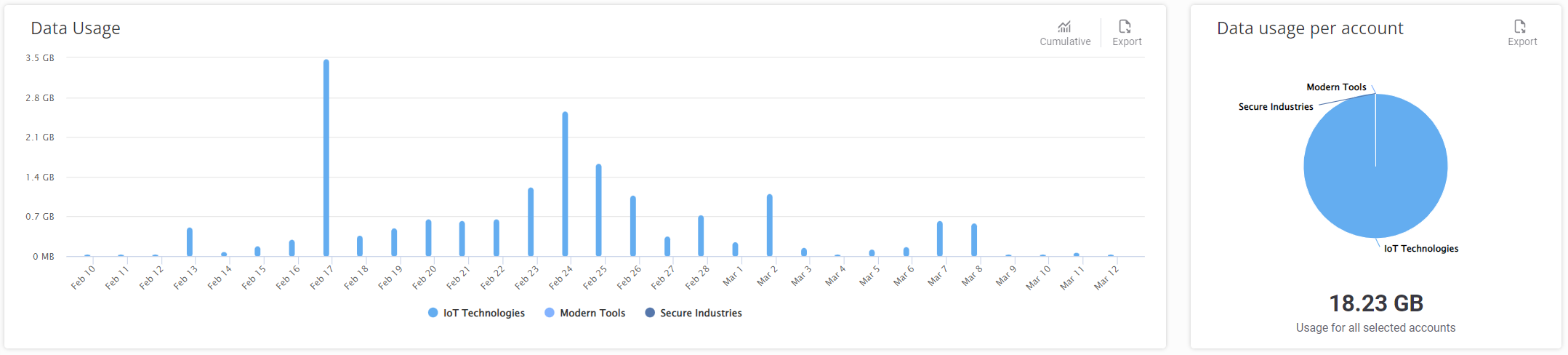 The Data Usage display shows the total Data usage of all SIMs in the Selected Accounts over the user-defined length of time. Here is an example of the Sub Accounts Data Usage and its pie chart showing the data usage over the selected time period.