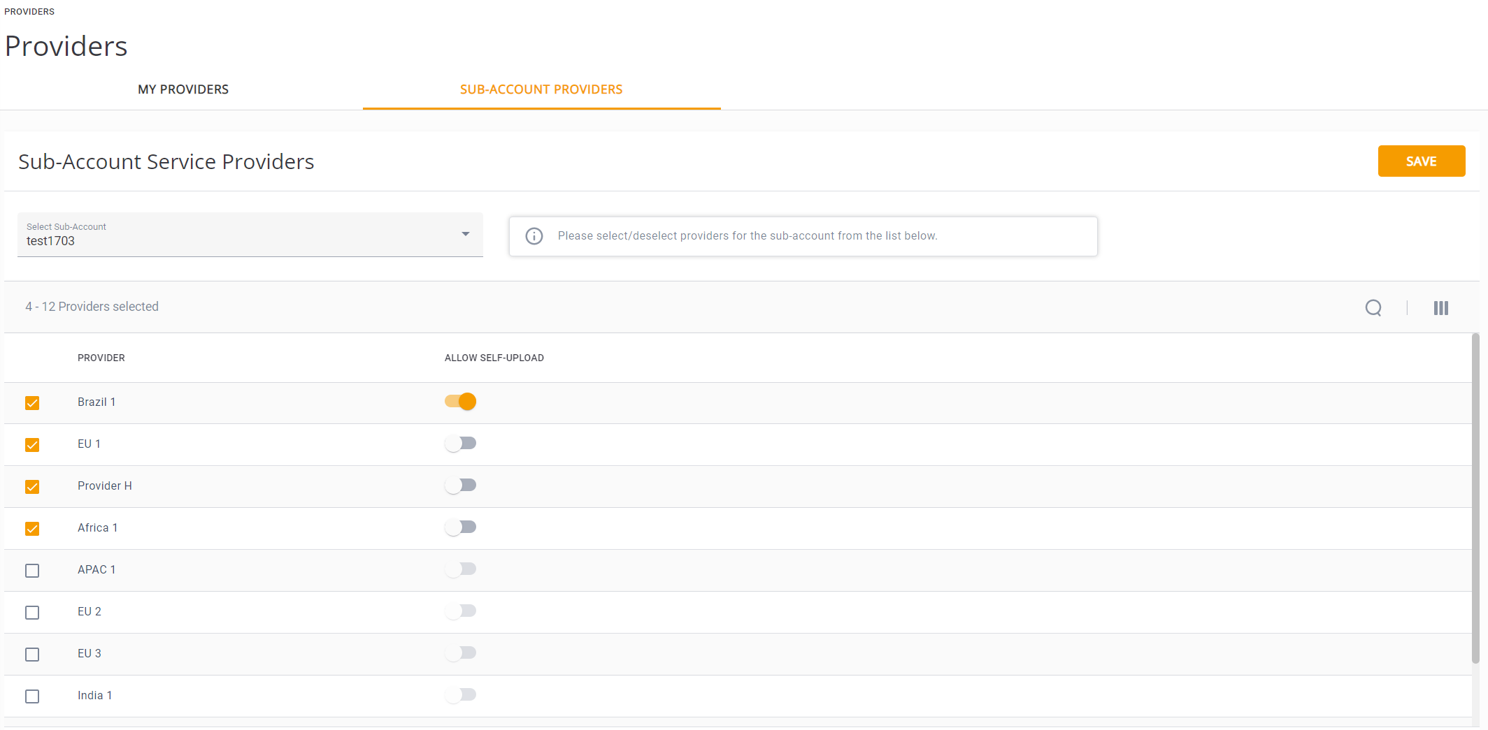 Providers Page Sub-Account Providers Tab with Selected Providers