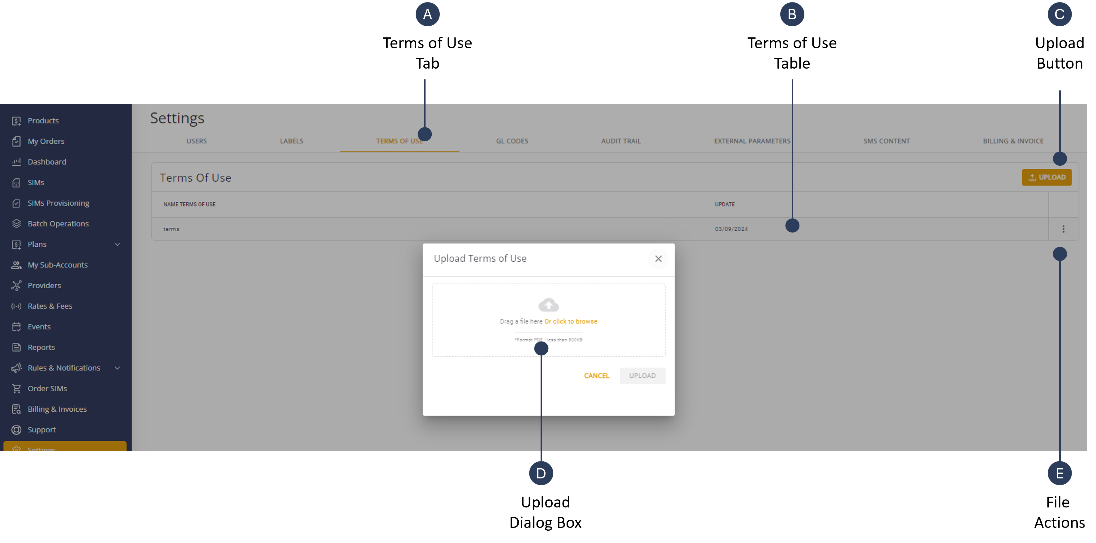 1. Place your PDF file in the Upload Terms of Use dialog box.