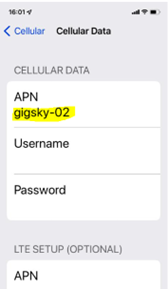 the APN field and enter the APN Name, for example gigsky-02.